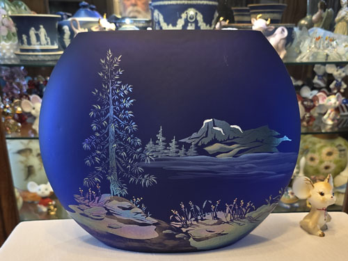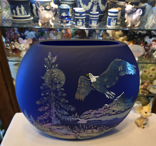 It is made of blue Favrene glass, a cobalt blue base infused with pure silver to create an iridescent sheen. The vase features a sand-carved scene of a soaring eagle, mountains, and trees. H/P M. Kibbe.
