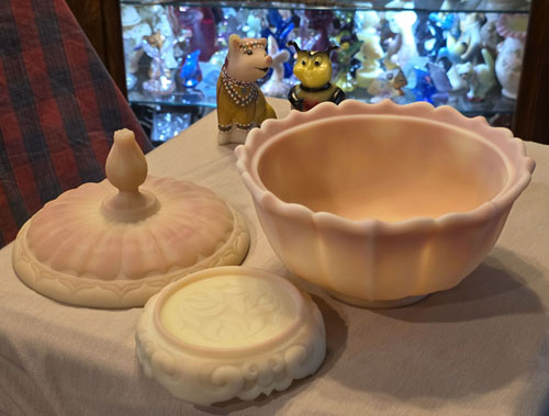 Fenton's Beautiful 3 piece Burmese Ogee Covered Dish.