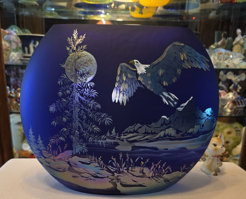 It is made of blue Favrene glass, a cobalt blue base infused with pure silver to create an iridescent sheen. The vase features a sand-carved scene of a soaring eagle, mountains, and trees. H/P M. Kibbe.